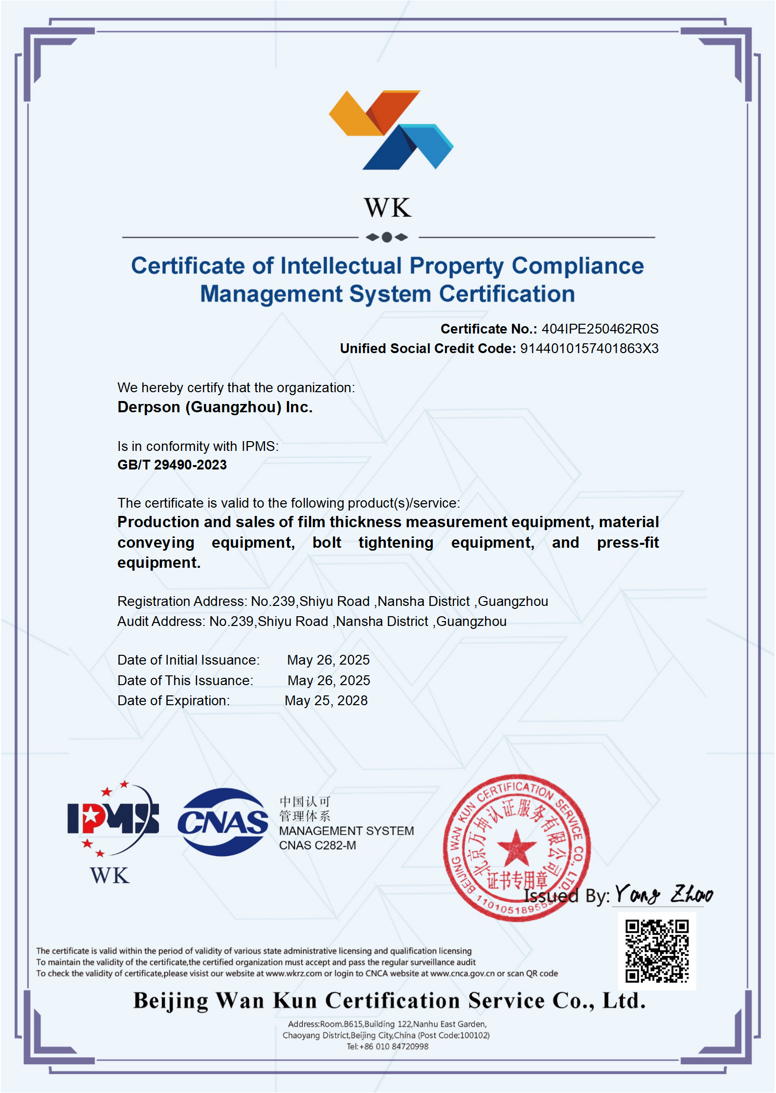 日前,廣州德準(zhǔn)獲得《知識產(chǎn)權(quán)合規(guī)管理體系認證證書》,知識產(chǎn)權(quán)管理體系符合:GB/T29490-2023,證書覆蓋范圍:薄膜測厚設(shè)備、物料輸送設(shè)備、螺栓擰緊設(shè)備、壓裝類設(shè)備的生產(chǎn)和銷售。廣州德準(zhǔn)會持續(xù)在行業(yè)內(nèi)專研技術(shù)開發(fā),為客戶提供好用的產(chǎn)品。感謝新老客戶的支持!